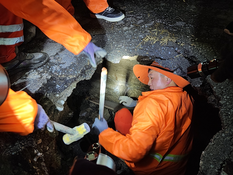 到达现场后,该段迅速组织布设好作业现场,根据现场实际情况认真分析研判,快速制定处置方案。在组织人员、机械快速清理塌陷处杂物淤泥的同时,确定塌陷位置范围大小,对灌注位置进行支撑和加固,并在塌陷处注入混凝土。经过3小时的奋战,塌陷路面已处置完毕,安全隐患已消除。