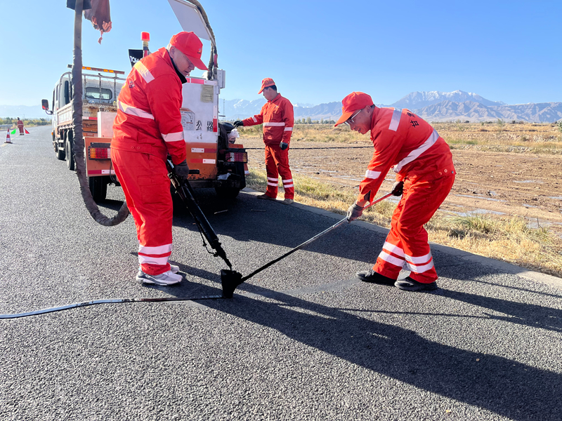 二是精准处治病害,夯实安全“根基”。为解决秋季路面裂缝易扩展、坑槽易滋生的问题,该段严格遵循“精细化、标准化”养护要求,在S301线、S237线开展路面灌缝作业,养护人员精准把控灌缝深度、宽度及灌缝胶温度参数,技术人员全程跟班作业,加强技术指导,确保开缝位置精准、清缝无残留、灌缝饱满密实。同时,现场严格按规范布设养护作业区,配备专职安全员与交通引导员,规范设置安全警示标志,为作业安全有序推进保驾护航。目前,完成秋季路面灌缝16061延米,有效延缓了路面病害的发展。
