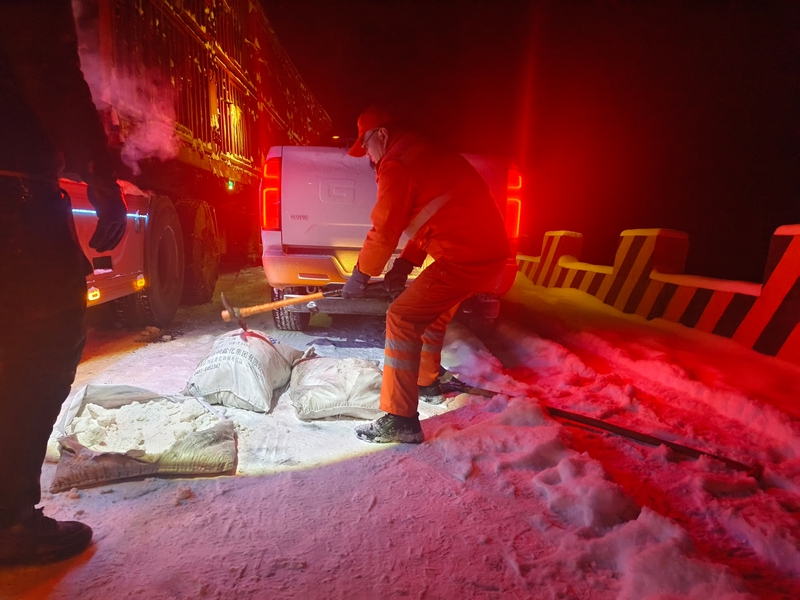 抵达现场后,救援人员看到一辆重型半挂车被困在结冰坡道上,车轮空转打滑无法前行,400余只活羊在风雪中挤作一团。养护职工们不畏严寒,一边安抚牧民情绪,一边分工协作,撒布融雪剂破冰、铺撒防滑料增阻、清理路面积雪。在零下十几度的低温中,大家手脚冻得发麻,仍坚持连续作战,一刻不停。